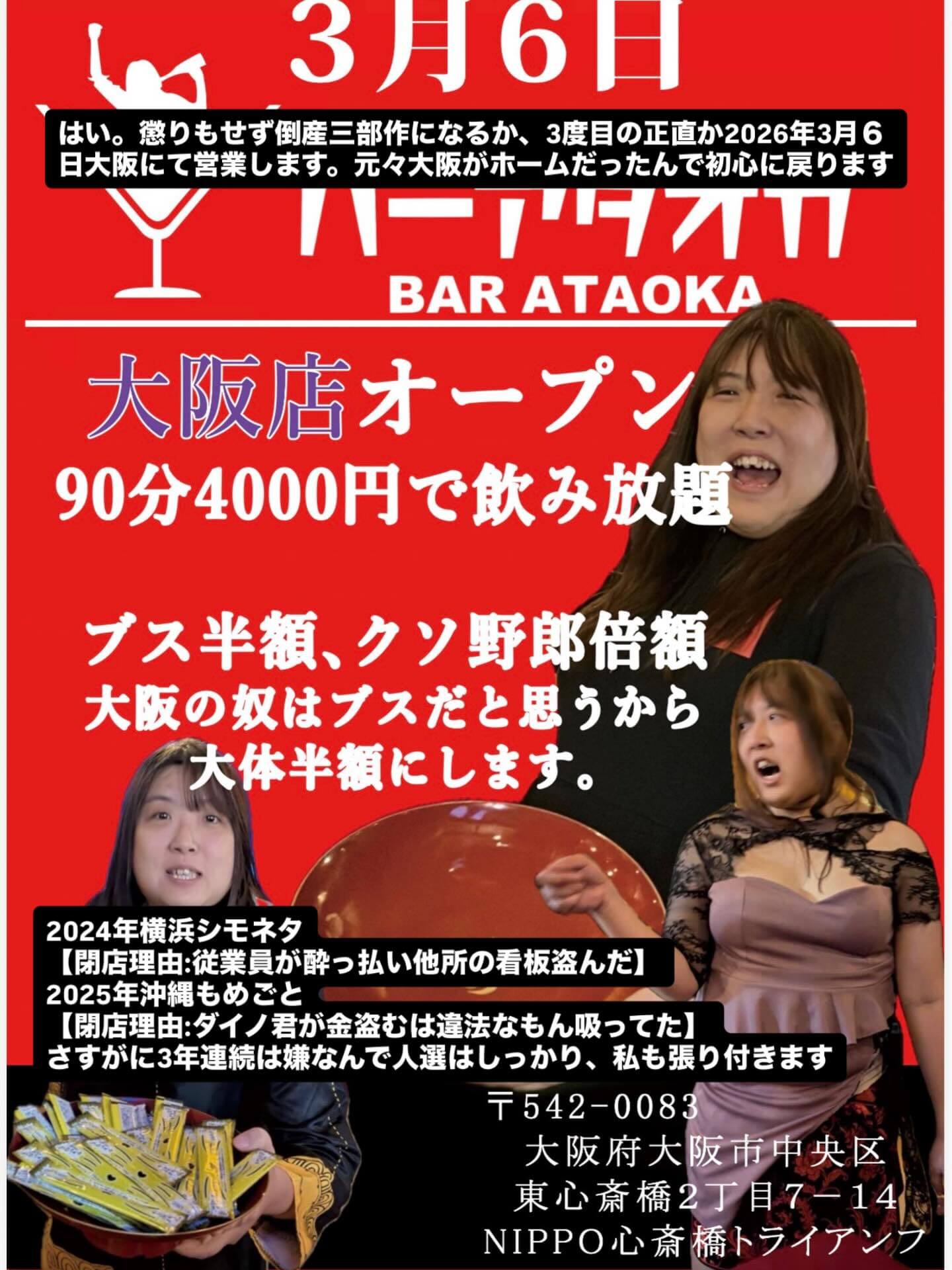 2026年3月6日。大阪・道頓堀に「Bar アタオカ 大阪店」オープン。